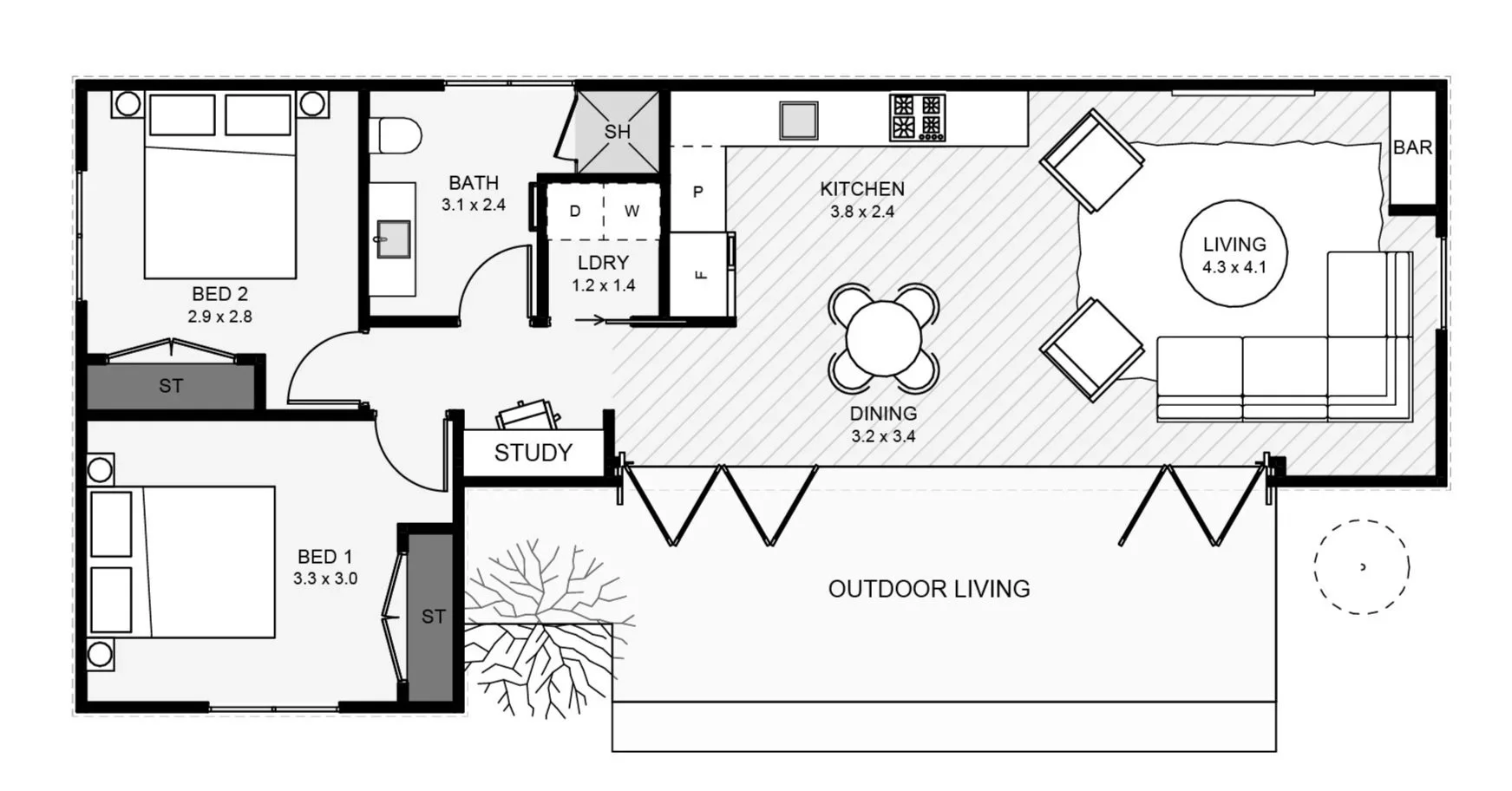 Sharp, clean, and clever. This 70sqm dwelling is all about modern styling with a flat-roof form, stacked lines, and big sliders that open the living right up to the outdoors. Inside, you’ve got two bedrooms, a handy study nook, and open-plan living that keeps things flowing. It’s compact but punches well above its size.