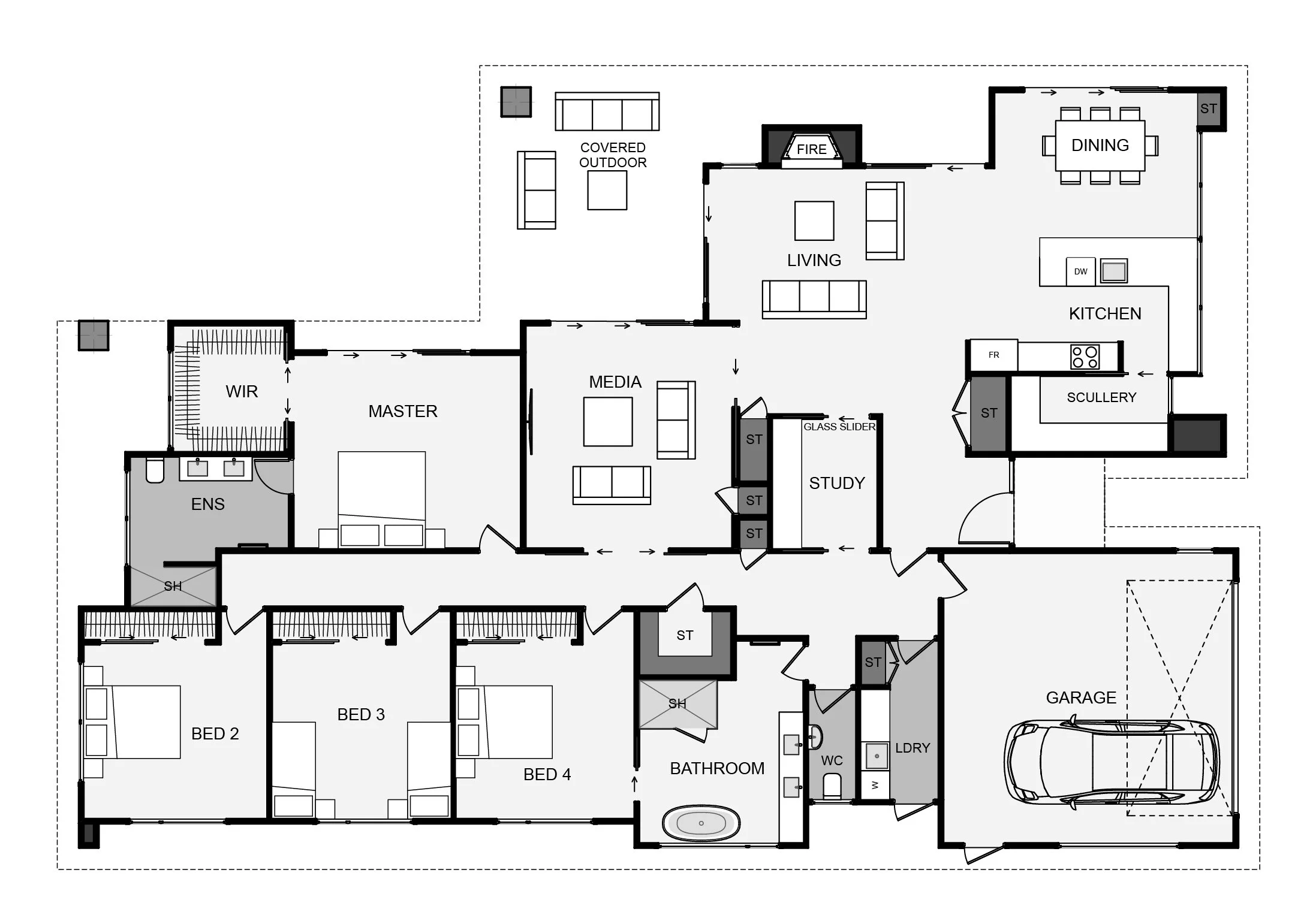 The Mataihuka is designed around two large gables and contrasting vertical timber cladding, giving this home a standout, classic look. Inside, there are four generous size bedrooms, dual access study, double living spaces, covered outdoor living, a scullery, separate laundry and plenty of storage. This home will make anyone a happy and proud owner!