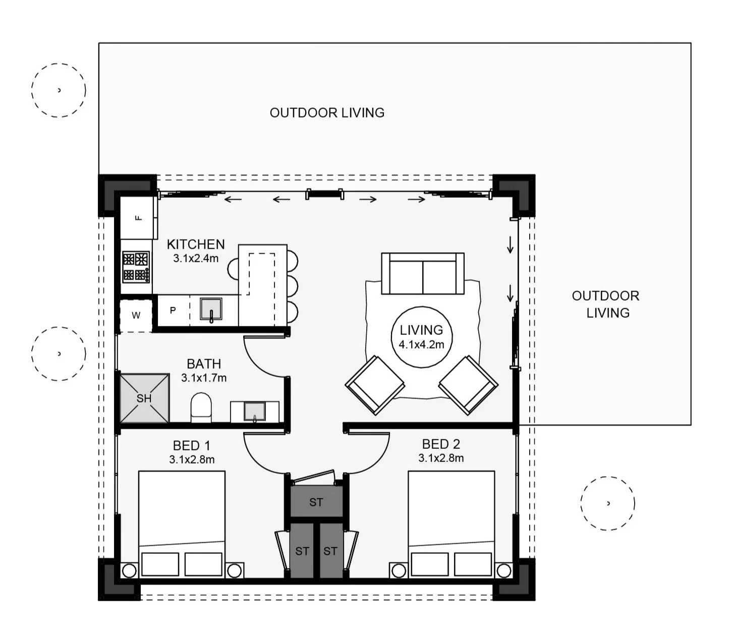 This modern, square-shaped home is both transportable and architecturally stylish. Inside, there are two bedrooms, a stepped living area, and a kitchen with breakfast bar. The house is also designed with both morning and evening outdoor living in mind to make the most of the natural light. If you like small, modern and two bedrooms is enough, this is your chance to build it!