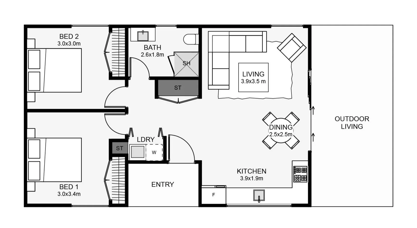 This classic, gable dwelling will look sharp wherever you place it. Inside, the bedrooms and living nearly appear as separate wings. The bathroom, laundry and covered entry void make this happen. Simple and timeless are two words that describe this home well.