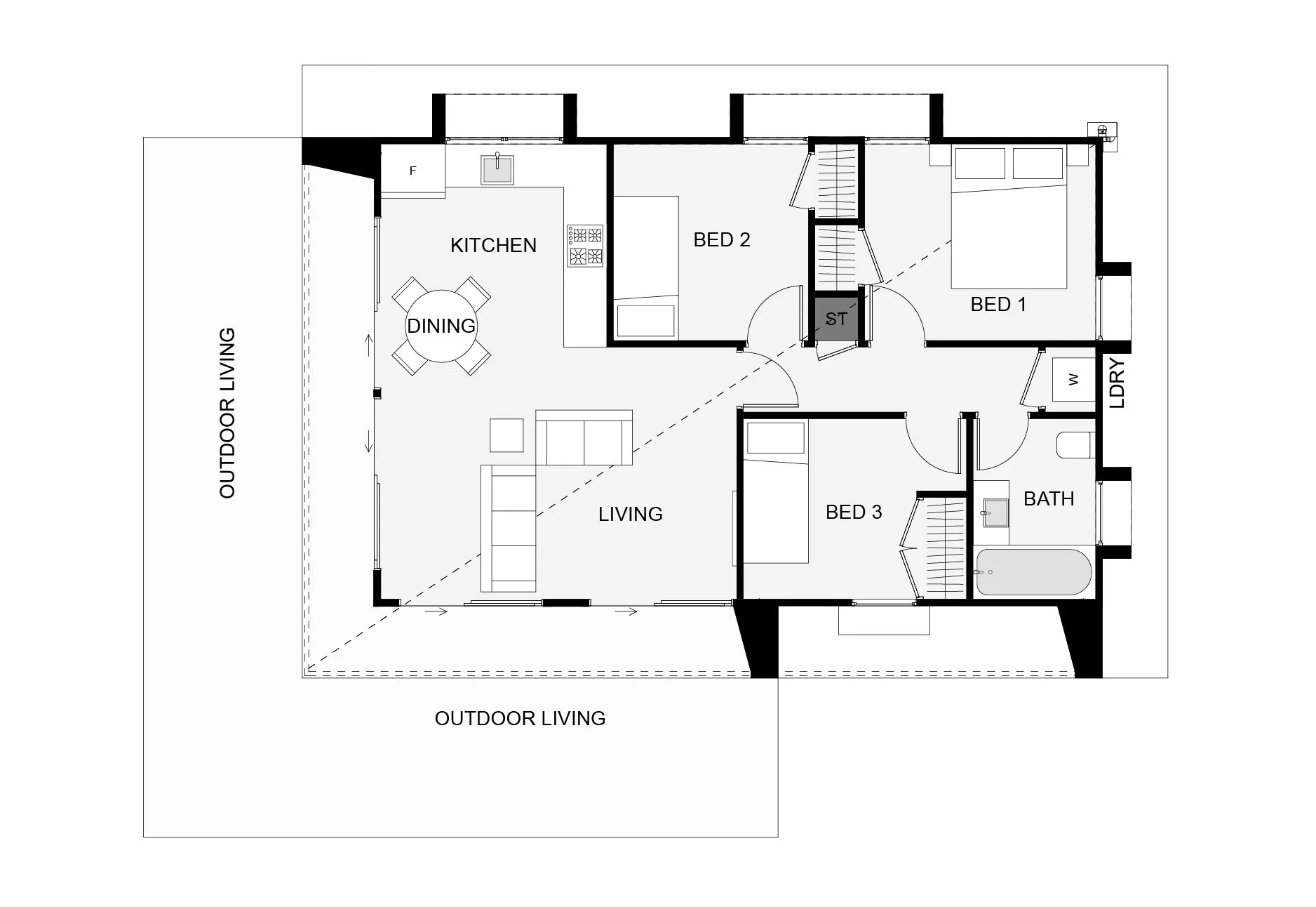Full height glazing allows the living space in this home to feel bigger than expected. Exterior wing walls allow for privacy and provide great support points for a larger roof overhang while maintaining a contemporary style. Featuring three bedrooms, this minor dwelling offers that little bit extra from a small footprint.
